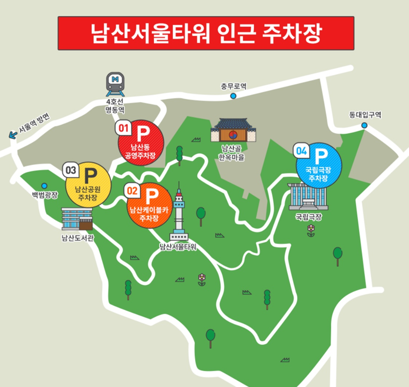 남산타워는 생태 환경 보전을 위해 일반 차량의 진입을 제한하고 있습니다. 따라서 주변 주차장을 이용한 후 도보로 이동해야 합니다. 남산타워 인근에는 총 4곳의 주차장이 있으며, 주차 위치에 따라 남산타워까지의 경로가 달라집니다.