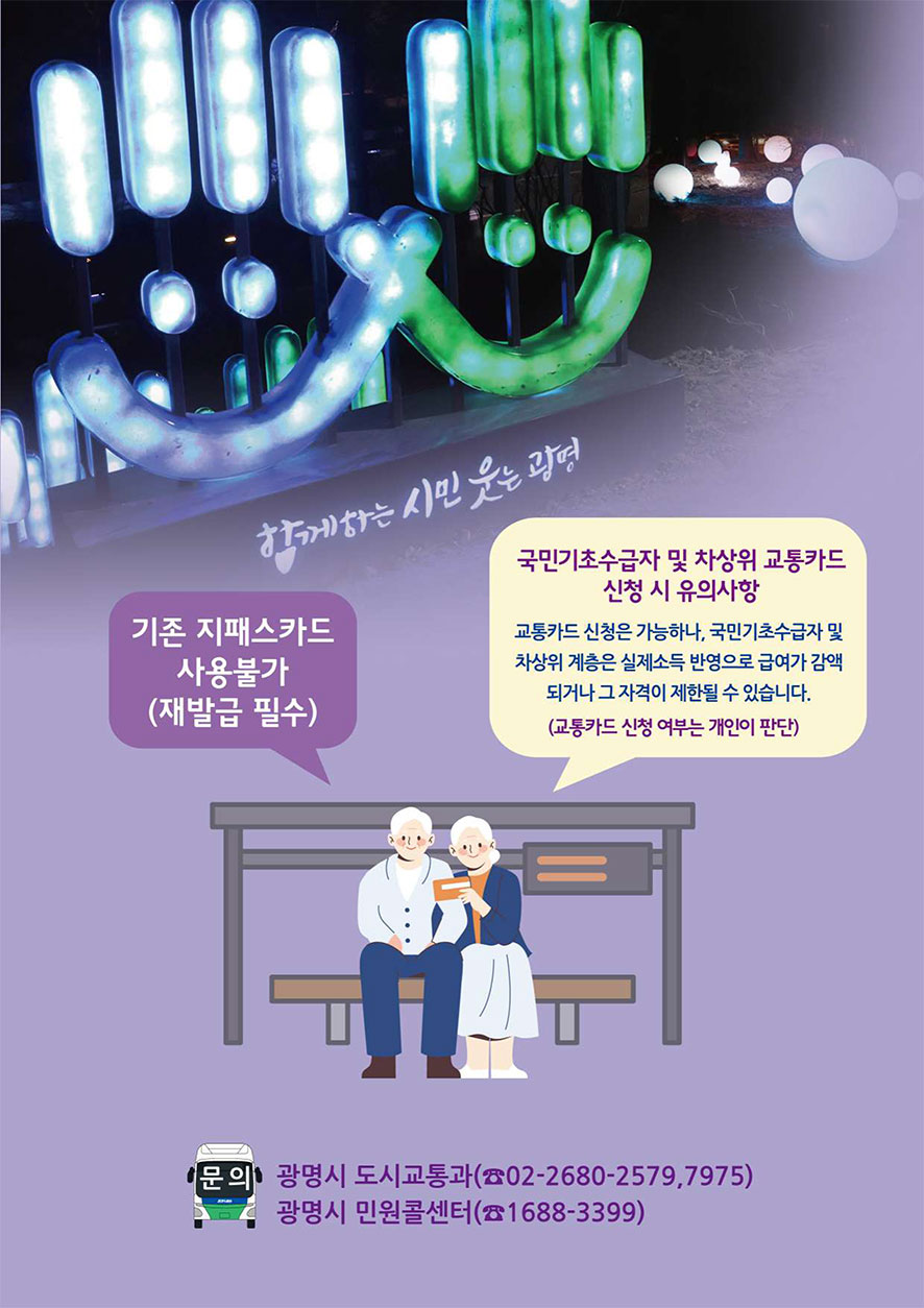 - 본인 확인: 노인교통카드는 반드시 본인만 사용해야 합니다. 타인 사용 시 재발급 제한 등의 불이익이 있을 수 있습니다.
