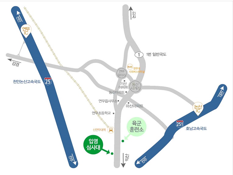 - 논산역에서: 201번(신촌) 시내버스를 타고 입영심사대 앞에서 하차하면 됩니다. 소요시간은 약 55분입니다.
