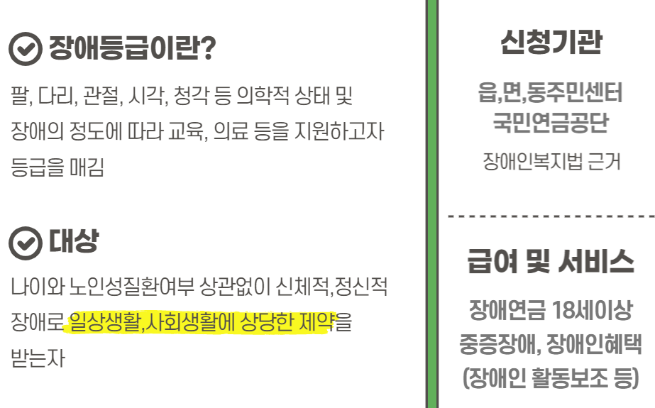 - 장애 정도: 중증장애인(종전 1급, 2급 및 3급 중복장애)