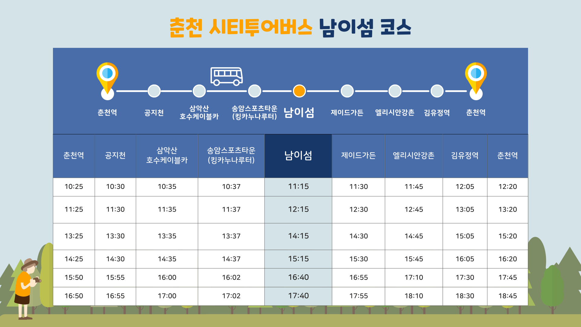 프로그램도 놓치지 마세요. 춘천시티투어버스가 여러분의 춘천 여행을 더욱 특별하고 편안하게 만들어드릴 것입니다.